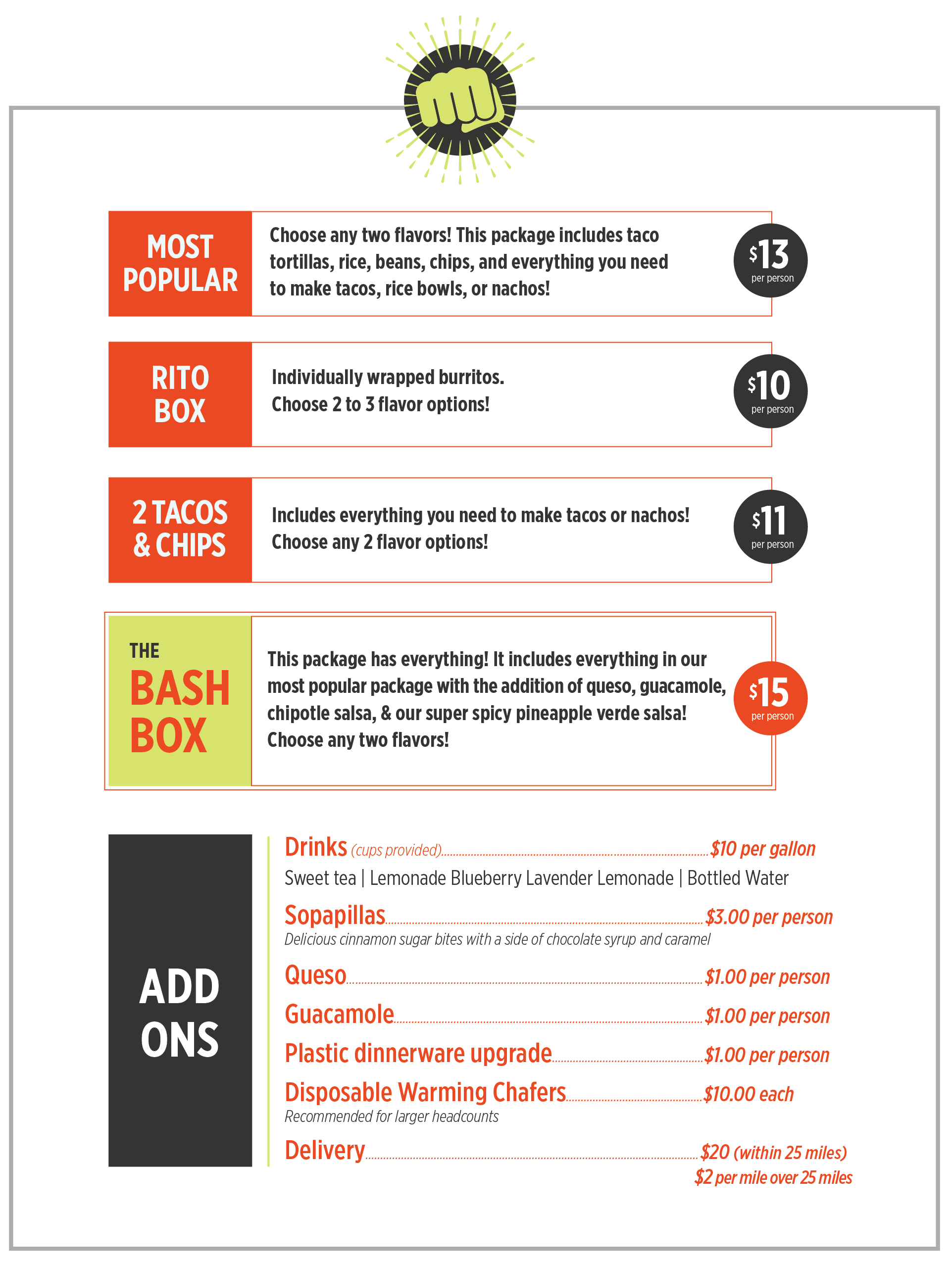 FISTFUL HAS YOU COVERED WITH SEVERAL PACKAGES TO CHOOSE FROM. WHEN THE TACOS ARRIVE, THE FUN BEGINS!